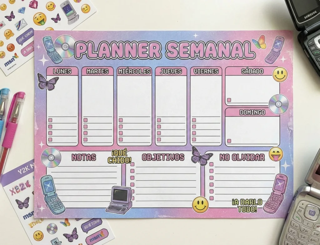 Un planner semanal para organizar tu semana, anotar compromisos, recordatorios y pensamientos — de la forma simple y bonita en la que lo hacíamos en los años 2000 ✨